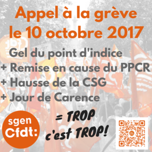 Le SGEN CFDT milite depuis des années pour améliorer nos conditions de travail. Il a lutté et obtenu la signature des accords PPCR permettant une amélioration de notre pouvoir d’achat. Le gouvernement revient sur les engagements pris, en nous faisant supporter de nouveau un gel du point d’indice, le jour de carence et la hausse de la CSG …