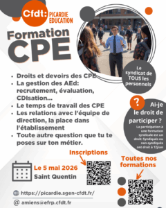 La CFDT Picardie Éducation a le plaisir de t'inviter à une journée de formation syndicale le mardi 26 mai 2026, à la Chapelle en Serval (60) sur le thème: "AESH: Statuts, carrière, droits et devoirs".